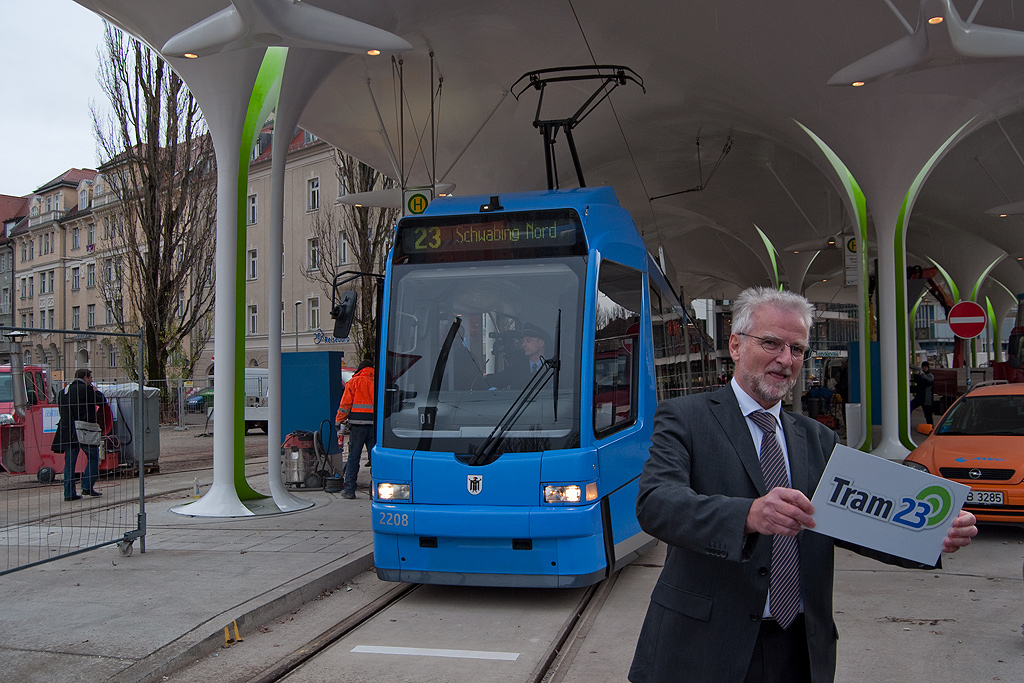 Однак реалізації цього варіанту завадили жителі цієї самої Herzogstrasse, які повстали різко проти трамвая з різними аргументами, як то: підвищений шум, ліквідація паркувальних місць вздовж вулиці, підвищення аварійності... Панорама вулиці. На жаль, в липні 2003 року під натиском цих виборців був прийнятий 2-й варіант трасування лінії. Таким чином, 12 грудня 2009 року розпочався регулярний рух по новому маршруту № 23 Münchner Freiheit - Schwabing Nord. Ось голова Мюнхенміськрансу Герберт Кеніг презентує новий маршрут: