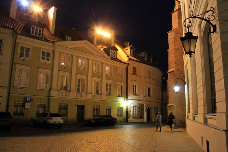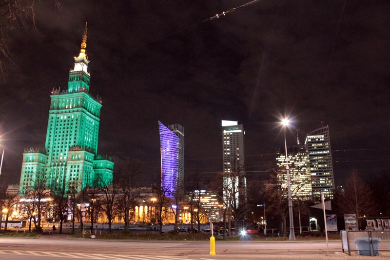 Зі Старого міста повертаємось у середмістя. Вечірній центр Варшави. Зліва – Палац культури і науки (Pałac Kultury i Nauki). Будівля – одна з найвищих у Польщі. Хмарочос має 42 поверхи. Висота – майже 168 метрів, а зі шпилем – 237 метрів. Споруджували Палац більше 3 років. На будівництві загинули 16 працівників. У кінці 80-х років будівлю пропонували знести, однак вирішили залишити. Наразі використовується як офісний та виставковий центр.