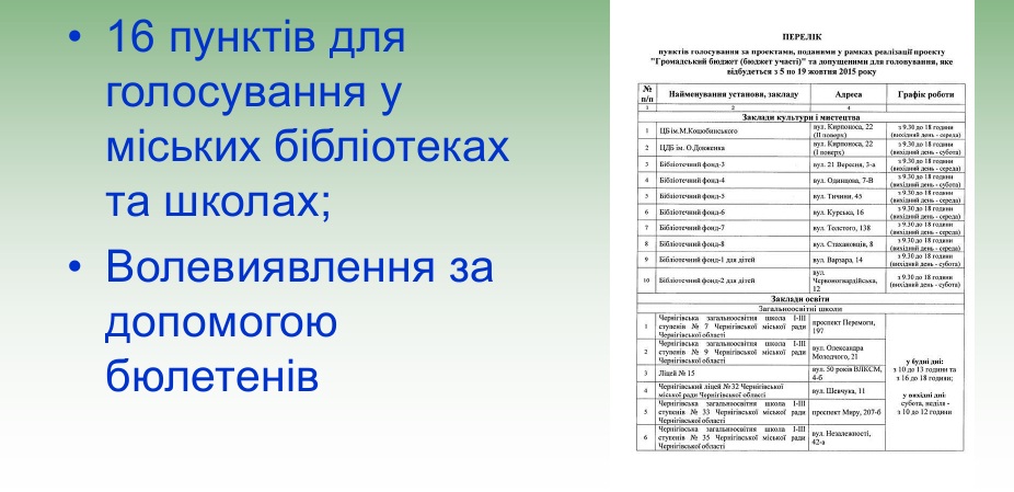 Було визначено 16 місць голосування: це бібліотеки і 6 шкіл, де немає бібліотек, їхній перелік було вивішено на сайті. Ми розробили бланки для голосування, і кожен громадянин Чернігова мав можливість проголосувати по двом категоріям проектів – окремо за поточними, окремо за капітальними видатками. Голосувати можна було, пред’явивши паспорт, його дані вводилися у єдину базу даних, аби уникнути подвійного голосування.