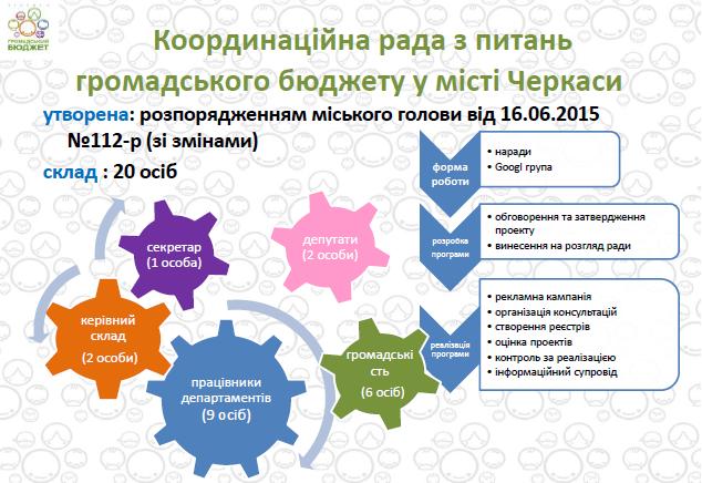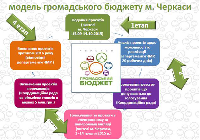 У Черкасах офіційна історія бюджету участі розпочалася з розпорядження міського голови у червні 2015 року. Незабаром була створена координаційна рада з 120 осіб, що працювала переважно у формі нарад і гугл-груп – вирішили, що недоцільно часто збиратися. Громадський бюджет Черкас було затверджено міськрадою 20 серпня 2015 року як міська цільова програма. У дискусіях було вирішено прибрати малозрозуміле слово «партисипаторний» на більш доступне – «Громадський бюджет». Програма розрахована на 5 років, і передбачається щорічно виділяти 5 млн грн на міські проекти городян, при доходах міського бюджету у 2015 році у 684 млн грн це складає 0,7%. Ще 50 тисяч грн додатково щорічно передбачено на департамент реклами для популяризації проекту.