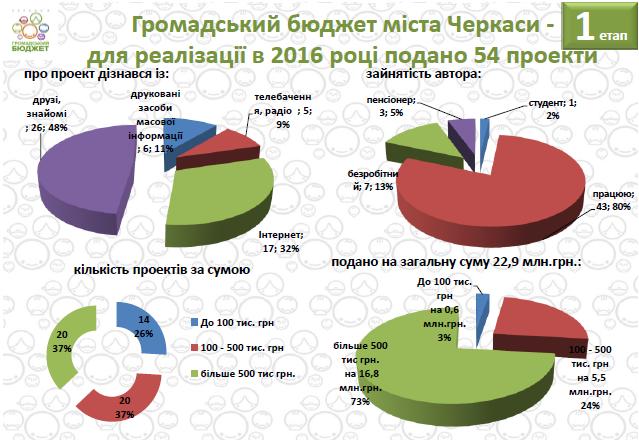 Всього було подано 54 проекти: електронною поштою або паперово, на першому поверсі міськради. Найбільш активними авторами стали городяни у віці до 30 років, 91% проектів було подано у останні дні подачі, термін подачі проектів складав 1 місяць. Ми гордимося – у нас гендерна рівність, 27/27 чоловіків/жінок! Ми не проводили багато публічних зустрічей, як у Чернігові, рекламна кампанія у нас була у стислі строки і ми більше покладалися на інтернет. Найбільше подавали проекти працюючі – відповідно, зустрічі треба робити у неробочий час. Суми: автори могли самі визначати суму до 1 млн грн., проектів з бюджетами від 100 до 500 тис і понад 500 тис – у нас приблизно рівна частина. Загалом проектів було подано на суму 23 млн грн.