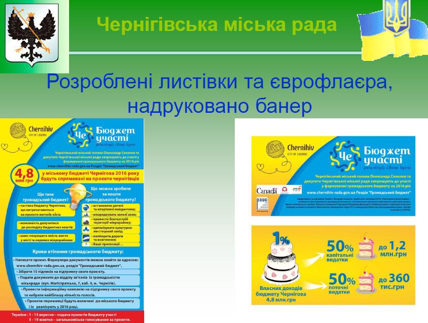 У нас на бюджет участі передбачається виділення у 2016 році 1% від власних доходів Чернігова – це 4,8 млн грн. 50% суми буде направлено на капітальні проекти, 50% – на поточні. Ми обмежили вартість одного капітального проекту до 1,2 млн грн., а поточні витрати – до 360 тис. грн., такі норми є у польському місті Лодзь. Відповідно до положення, почали проводити з 1 вересня інформаційну кампанію – по телебаченню, у газетах, на сайтах, випустили листівки, які розклеювали у школах, у транспорті, проводили зустрічі.