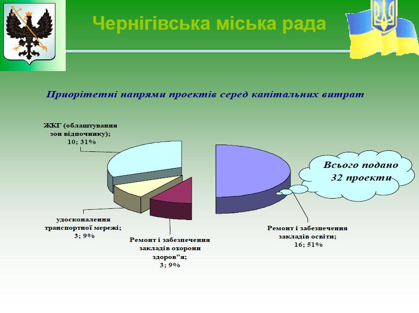 Серед поточних витрат перемогло 13 проектів на загальну суму 2,437 млн. Серед них – проект створення інформаційно-культурного центру на житловому районі Масани, де немає бібліотеки. Тут люди хочуть створити інформаційний простір, куди могли б приходити, спілкуватися, передбачається бібліотека, комп’ютерний клас і зона спілкування. Також цікавий проект – благоустрій біля готелю Брянський на березі Десни, тож ми отримаємо ще один міський пляж. Цікавий проект – «Чернігів у віках», це оформлення фасадів міста на історичну і іншу тематику, і вже згадувана служба соціального таксі.
