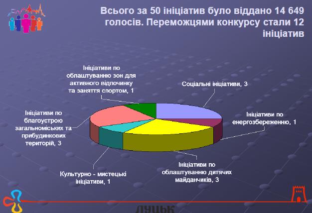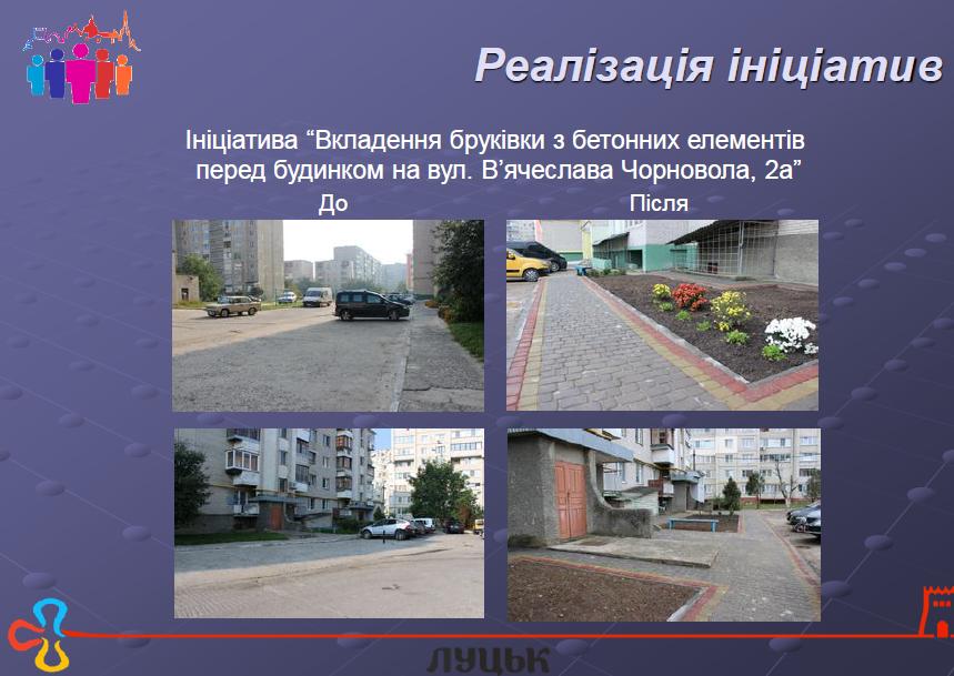 Одна з ініціатив стосувалася ремонту помешкання, де живе троє інвалідів – за неї голосувало багато мешканців. Був проект облаштування спортмайданчику – виграло ОСББ. Також була ініціатива по благоустрою – облаштувати сквер, поставити дуже гарні лавки і присвятити це Степану Бандері. Дитячі майданчики виграло три ОСББ, ініціативу з енергозбереження виграв голова домового комітету. Автори активно долучилися до промо проектів.