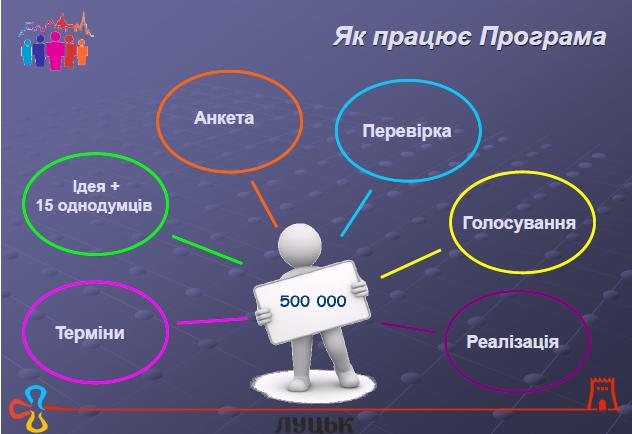 Загалом програму прийняли на 5 років, щорічно кошти в обсязі 5 млн грн резервуються на департамент финансової політики. Коли відбудеться голосування – кошти будуть перерозподілені на відповідні департаменти, у нас такий принцип працює і на бюджет розвитку. Також заклали 50 тисяч грн. на рекламну кампанію – у 2015 року її фінансував фонд. Також ми націлюємо авторів проектів, аби вони рекламували свої проекти, вже цього року деякі автори робили відеоролики і розповсюджували їх в інтернеті.