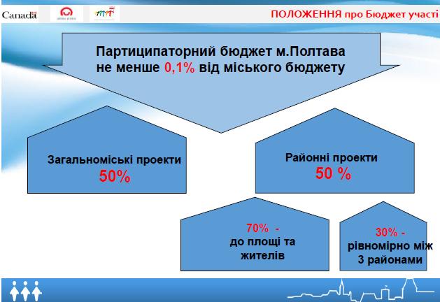 У нас передбачено 0,1% коштів від загального обсягу міського бюджету. Ми вирішили створити загальноміський і районні бюджети участі – відповідно до адміністративного поділу на райради, 50% загальної суми - на міські проекти, 50% - на районні. Була ідея створити поділ по ОСН – але не все місто поділено на них. Була пропозиція створити локальний рівень по межах виборчих округів, але врахували, що був передвиборчий період та аби не спекулювали кандидати, вирішили 30% коштів розподілити рівномірно по районах, а 70% ділиться пропорційно площі і кількості мешканців.