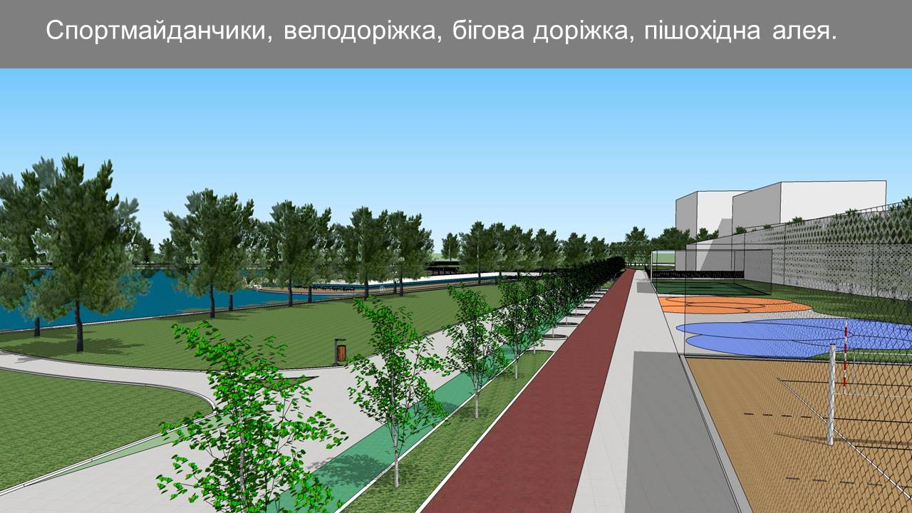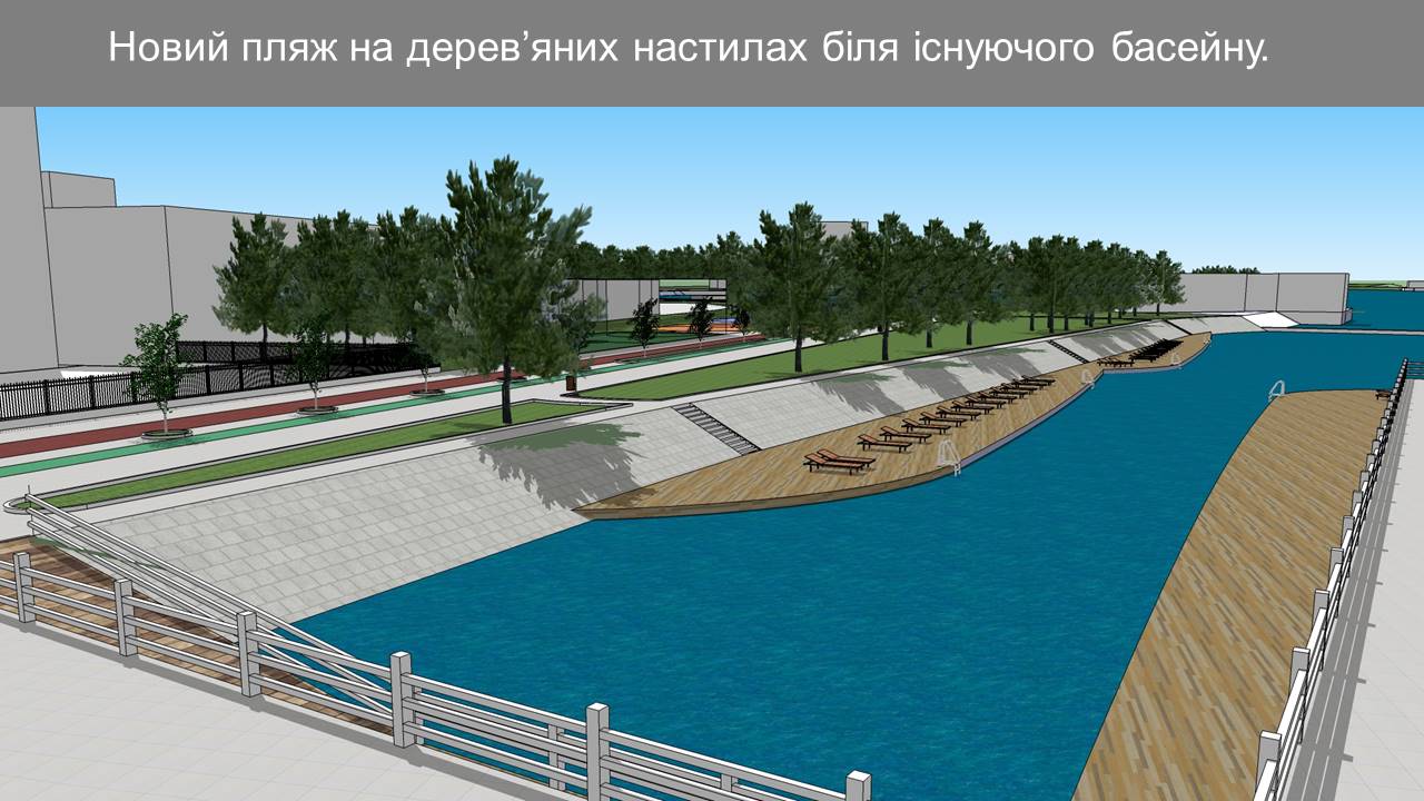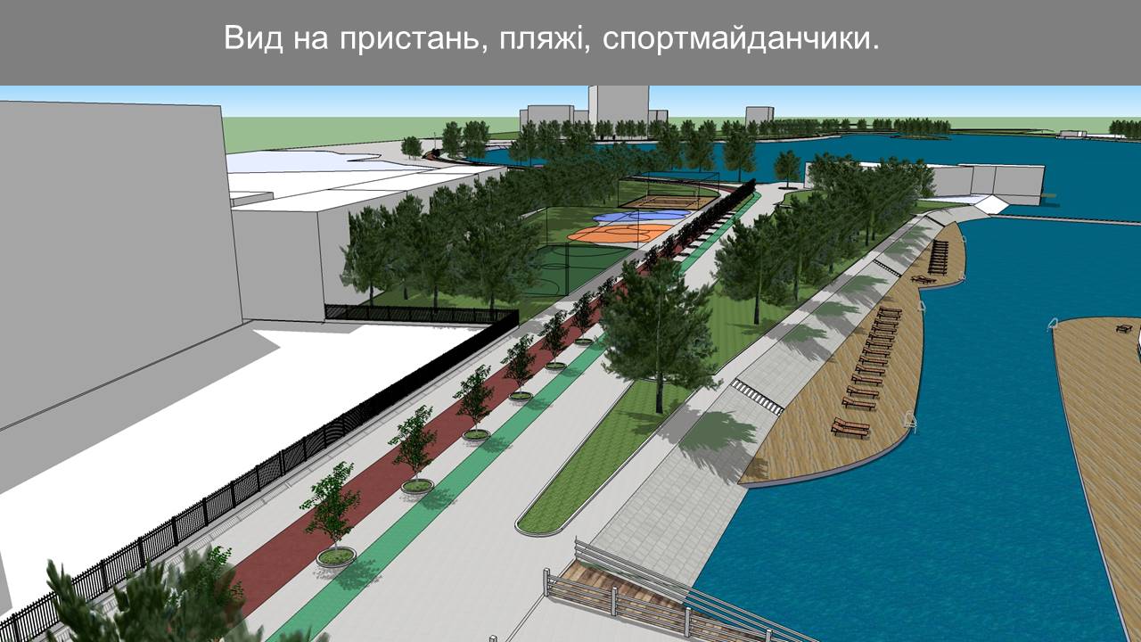 Окрім цього, планується облаштування пляжної зони з майданчиками для волейболу, пляжного футболу та тренажерів.