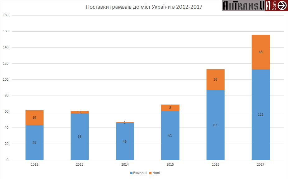 Цей рік знов видався рекордним по кількості поставлених вагонів за останній час - містами було отримано 156 трамваїв, з них 42 нових, 1 побудовано з використанням кузовів старих вагонів, та 113 вживаних (1 вживаний в середині країни). Про це повідомляє транспортний ресурс AllTransUA.