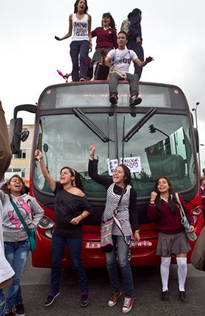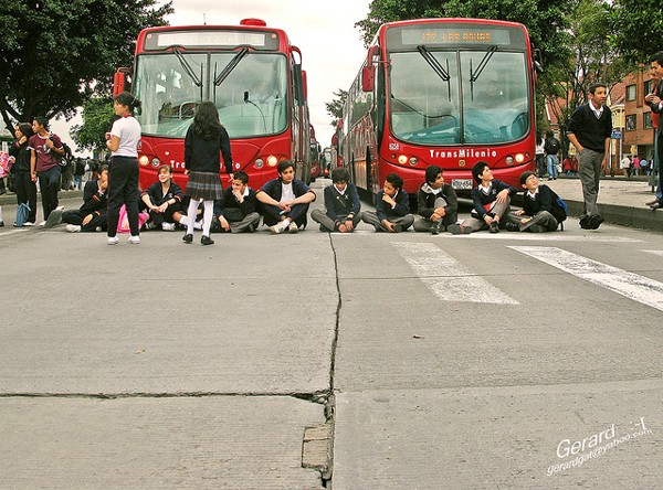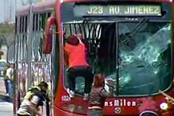 І ось тут почалося. Терпіння пасажирів увірвався. Повертатися в старі часи вони ні в яку не побажали. І почався бунт. Безглуздий в самій своїй спрямованості проти ні в чому не винних швидкісних автобусів. 9 березня цього року найбільш активна частина пасажирів - студенти вузів - вставши живим ланцюгом перекрили шість з дев'яти шляхів прямування швидкісних автобусів системи TransMilenio.