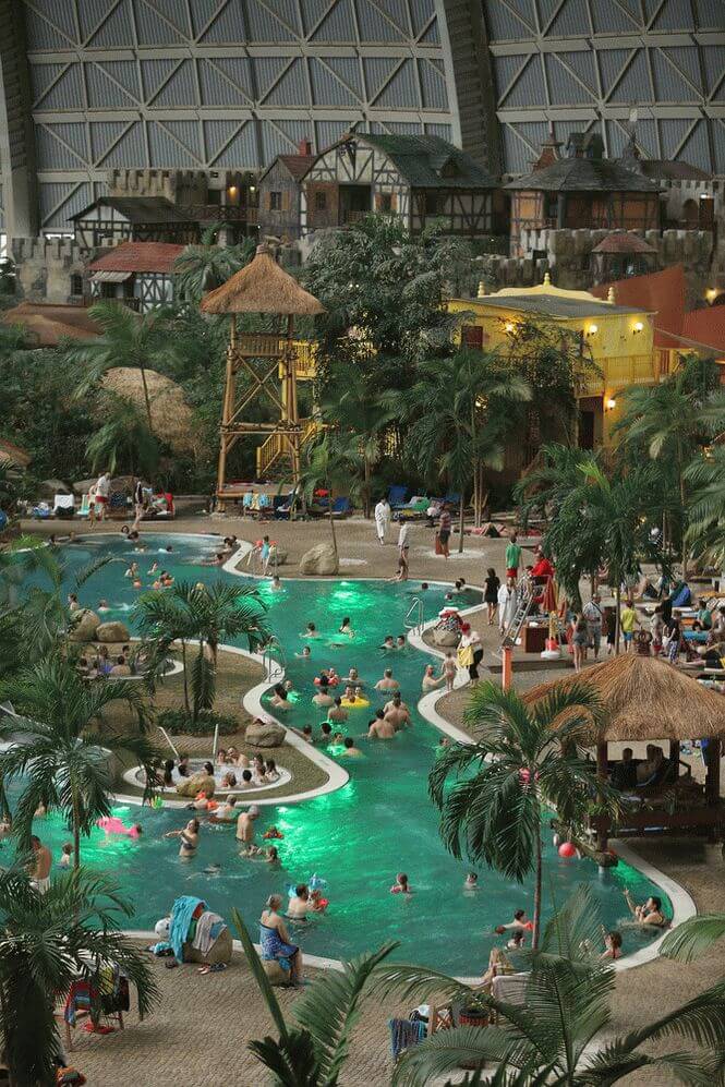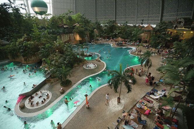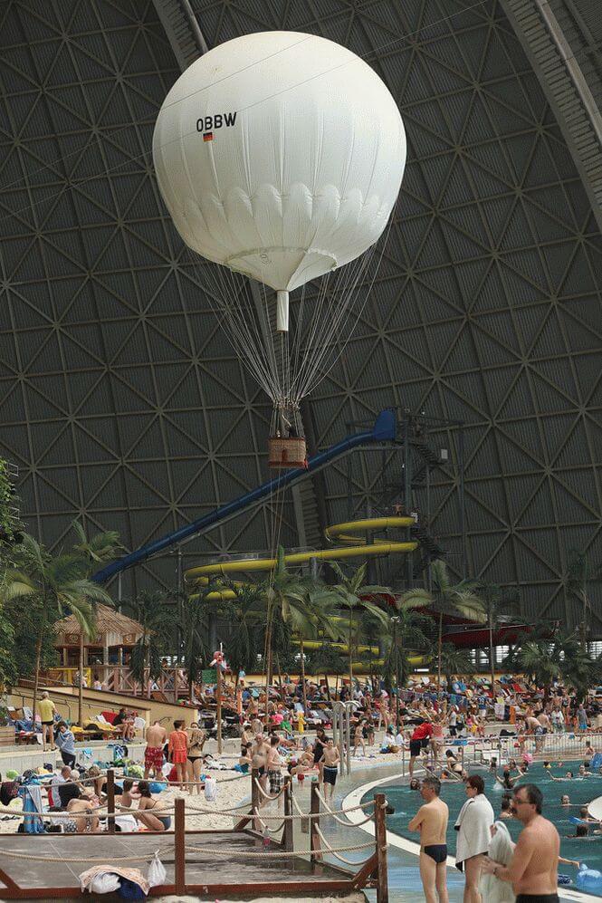 На гроші азіатських спонсорів в колишньому ангарі побудували унікальний парк відпочинку з власним мікрокліматом. Басейни обладнали в стилі природних водойм, а навколо них висадили тропічну рослинність.