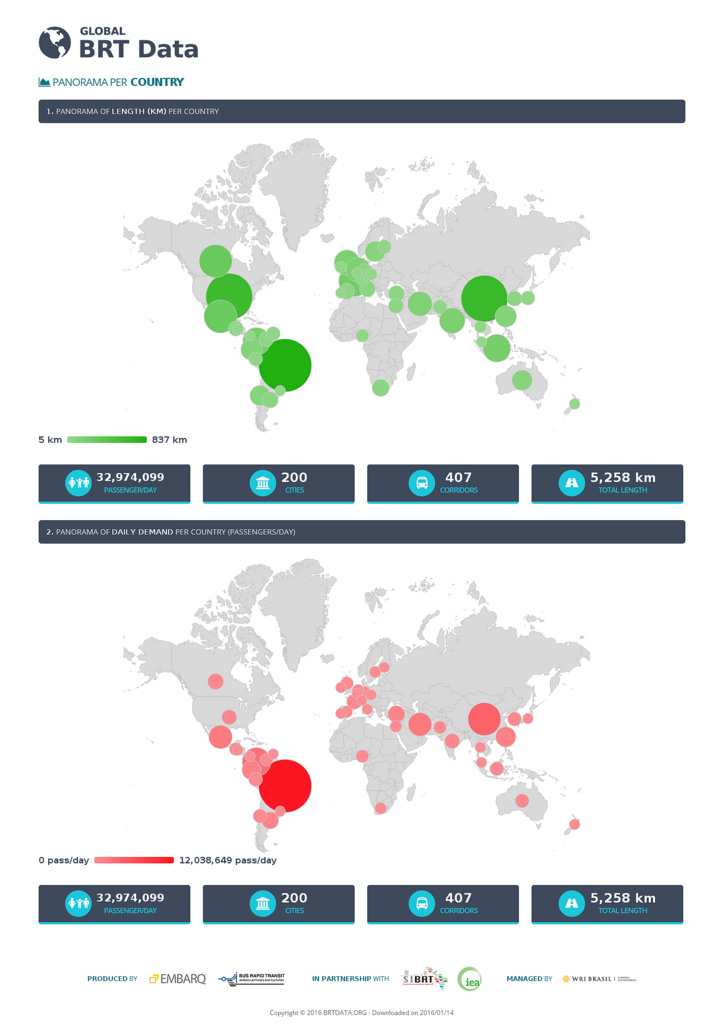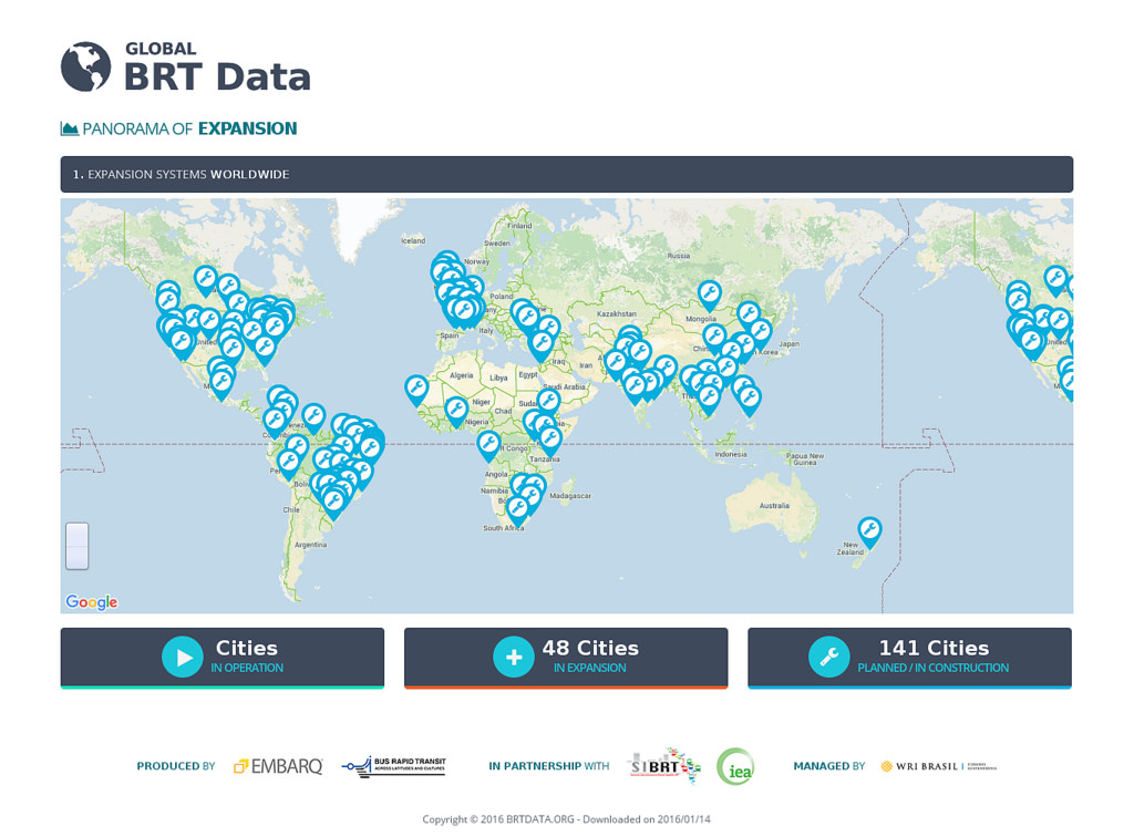 Сьогодні в 200 містах світу діють системи швидкісного автобусного транспорту – Bus Rapid Transit (BRT). Кожен день всі системи перевозять понад 32 млн пасажирів, а загальна довжина ліній становить 5 258 км. Інститут Світових ресурсів спільно з Міжнародним Енергетичним агентством, Латиноамериканською асоціацією Integrated Systems і BRT (SIBRT) і чилійським центром дослідження систем BRT створили ресурс http://brtdata.org/, що поєднує всі статистичні дані про всіх системах BRT у світі. Про це розповів блогер Данііл Суботін.