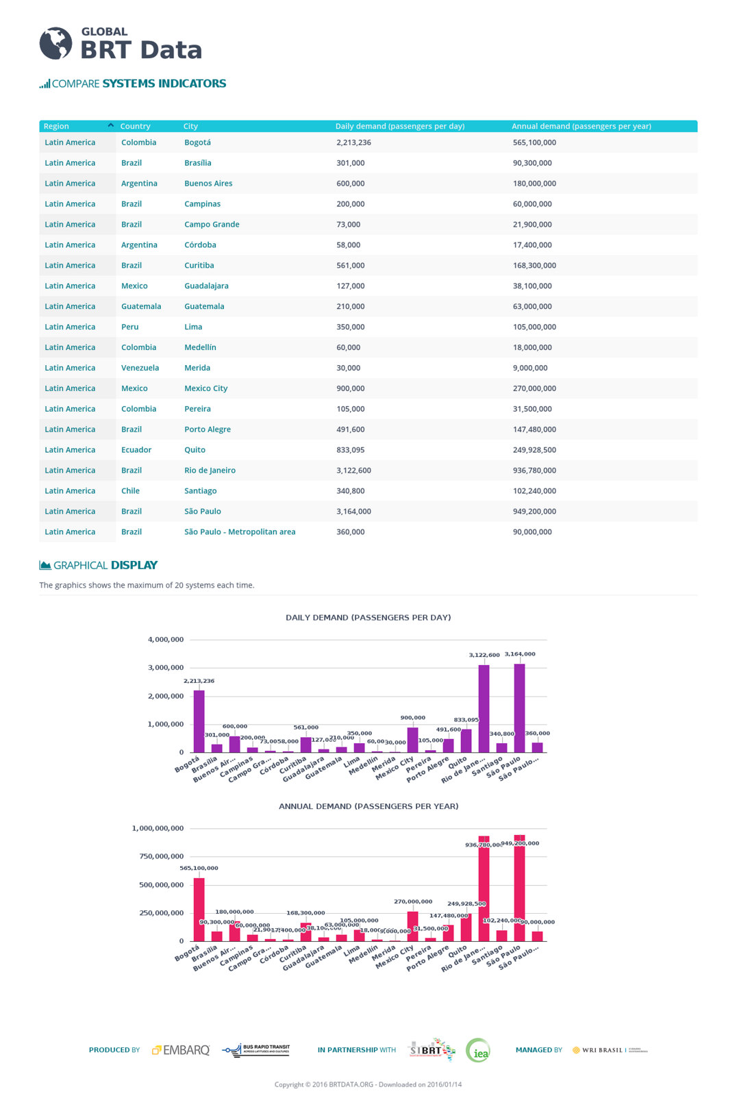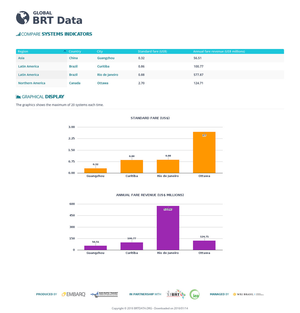 Консалтингова платформа BRTData.org охоплює різні показники по експлуатації, конструкції і вартості систем, у тому числі інформацію про інфраструктуру, продуктивність, рухомий склад, безпеку дорожнього руху та вартості проїзду систем.