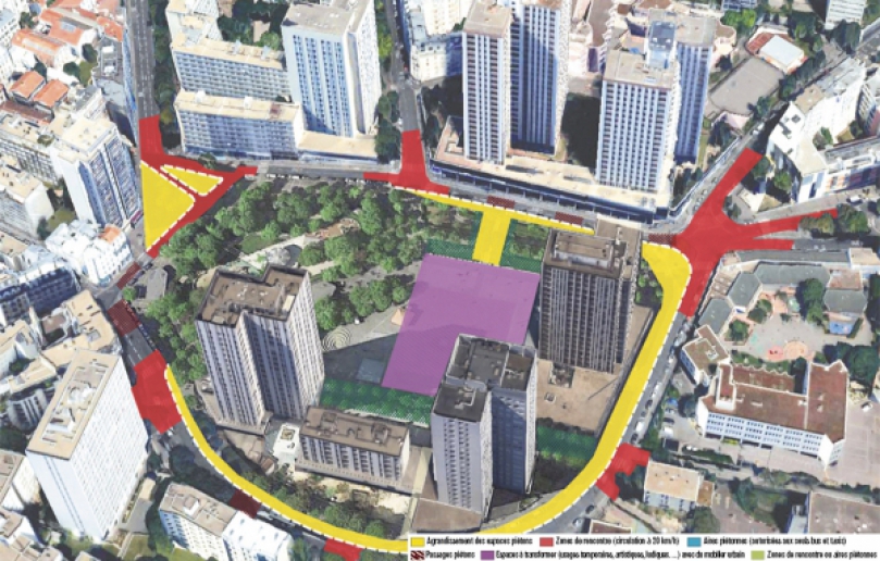 Всі периферійні тротуари розширять, озеленять та розчистять. Бічні алеї, з обмеженням руху до 20 км/год, позбавлять від автобусів, оскільки вулиця Жапон, розташована позаду мерії 20-го району, є кінцевою зупинкою. Решта навколишні вулиці можуть бути використані автобусами і таксі.
