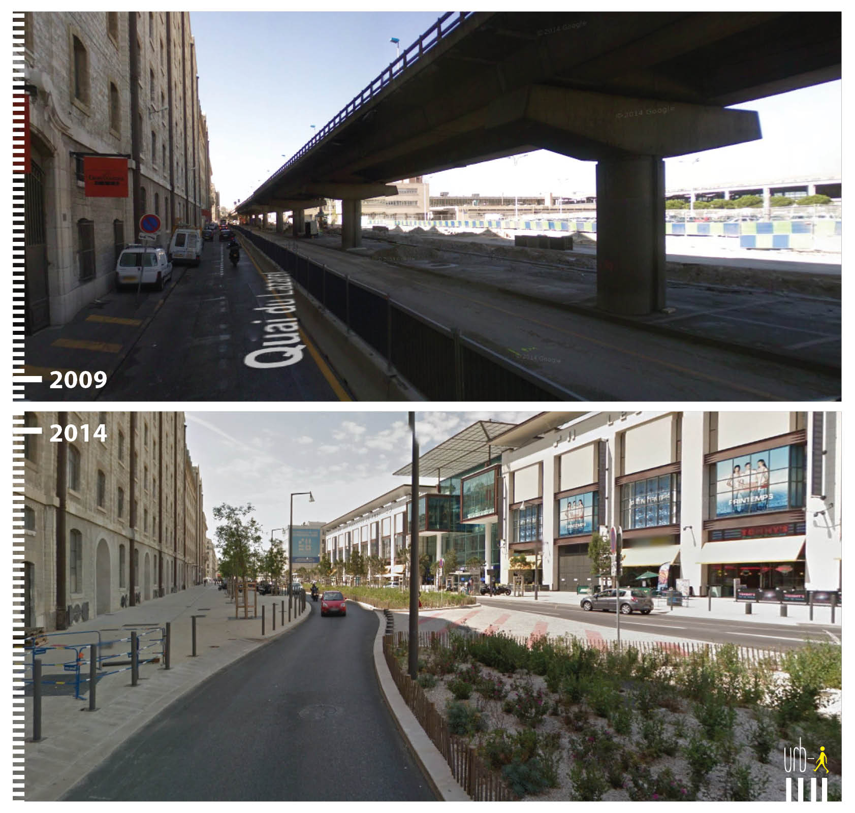 І знову до великих перетворень. Тут тепер замість естакади і жахливого проїзду без тротуарів - звивиста (для зниження швидкості) наземна вулиця з якісним пішохідним простором. Тут тепер і зелень, і відкриті фасади, і люди на вулиці.