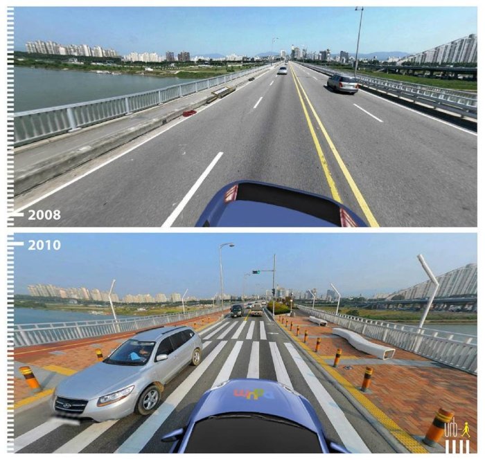 Зменшують кількість смуг навіть на мостах. Так. у Сеулі скоротили вдвчі кількість смуг - і отримали широкі тротуари і навіть променад з креативними лавками.