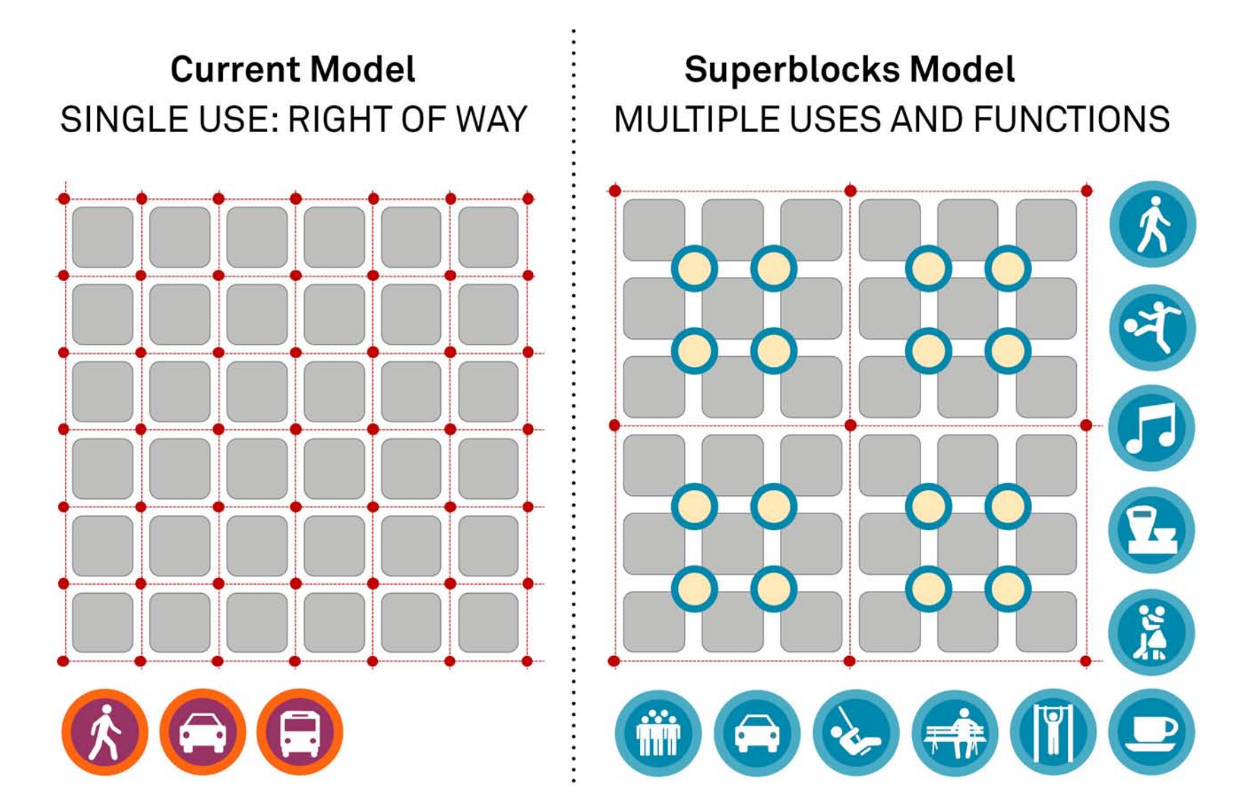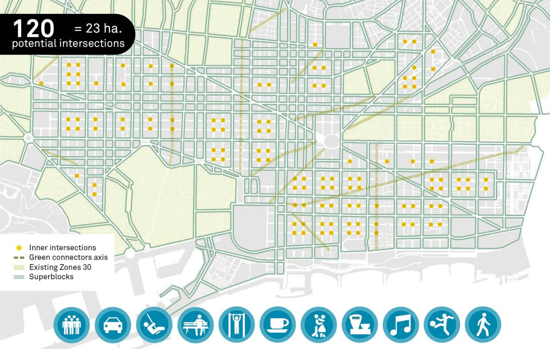 Для вирішення всіх цих проблем влада міста повернулися до ідеї, яку вперше озвучували ще 30 років тому. На основі кварталів Ешампле будуть створені житлові «суперблоки» на розмірами 400 на 400 метрів. Кожен такий «суперблок» об'єднає дев'ять кварталів. Всередину блоків зможуть проїжджати тільки машини резидентів і спецтранспорту, а також вантажівки для забезпечення місцевих магазинів. Швидкість руху всередині «суперблоків» обмежать до 10 км/ч в порівнянні з нинішніми 50 км/год (і 30 км/год в особливих зонах).