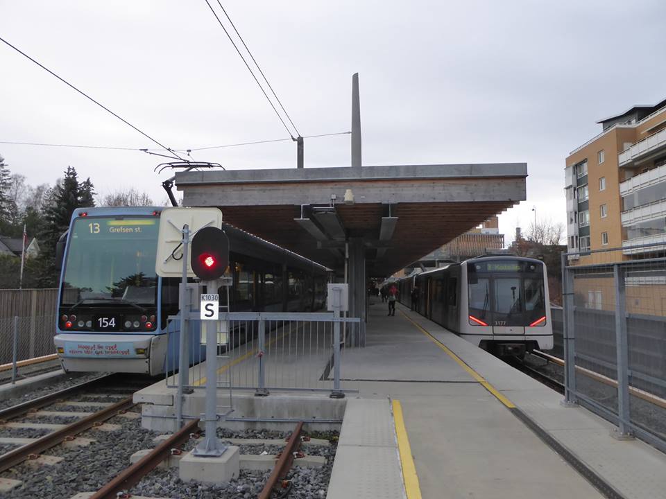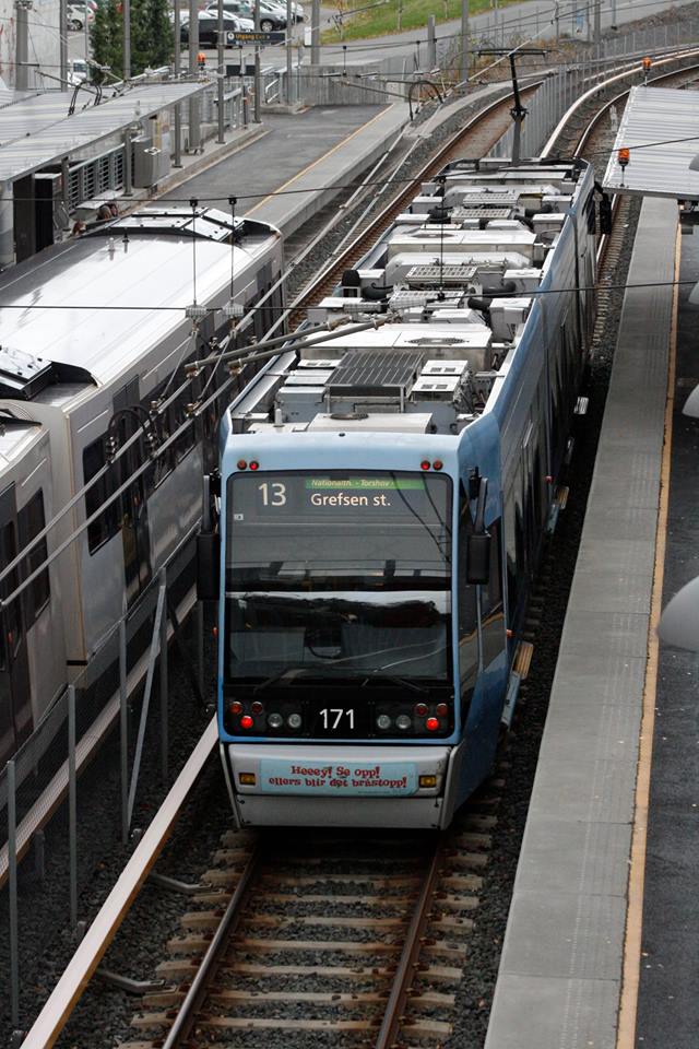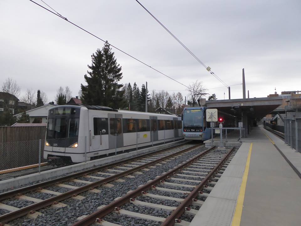 2. Поїзд метро та трамвайний вагон SL95 на станції Jar. Добре видно різницю в габаритах між метро шириною 3.16 метра та трамваєм шириною 2.65 метра.