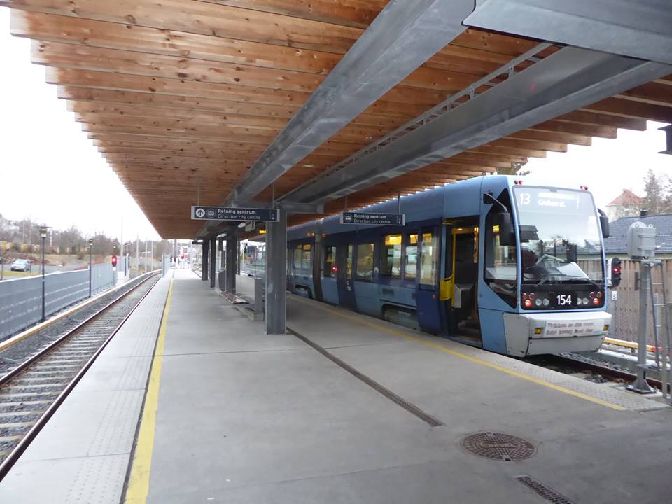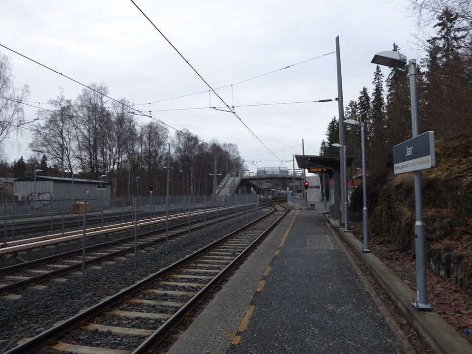 3. "Трамвайна" частина станції Jar. Так як трамвай має низький рівень підлоги та меншу ширину, то для нього тут побудували 2 бокові колії та низькі платформи.