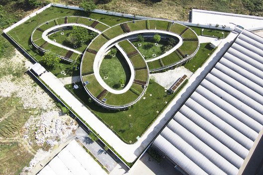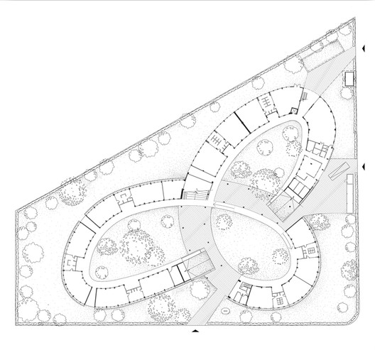 Зелений дах утворює потрійне кільце, оточуючи три двори всередині як безпечні ігрові майданчики. Всі основні функції розміщуються під цим дахом. Як дах знижує на дворі, він забезпечує доступ до верхнього рівня і городів наверху – місце, де діти вчаться важливість сільського господарства і відновлення зв'язок з природою. Нещодавно експериментальний город був реалізований на даху, тут висадили п'ять різних видів овочів на площі 200 кв. метрів як сад для сільської освіти.