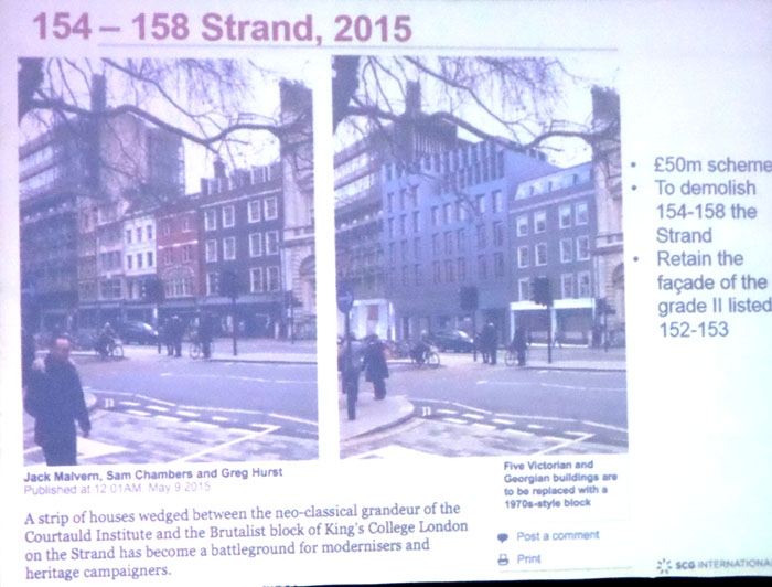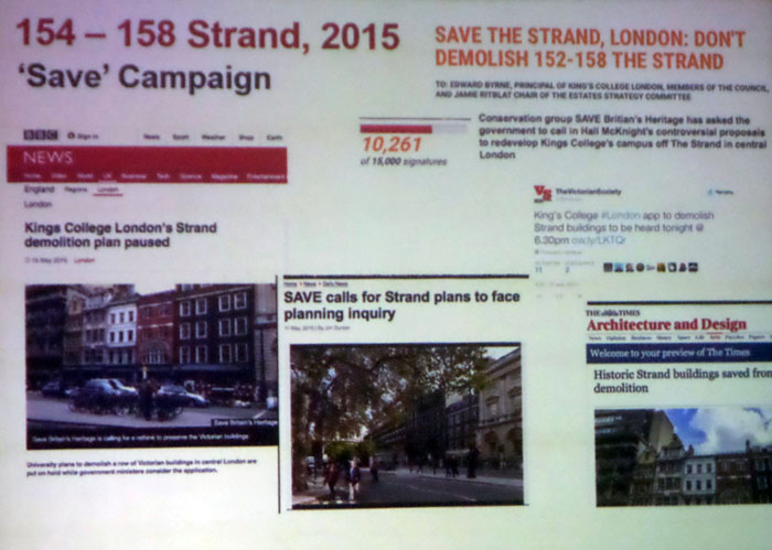 Це не просто приклад протестів проти знесення, ми бачимо, як суспільство змінюється. Там, в тих будинках, немає квартир, там тільки рітейл і офіси, але громада, жителі вулиці Стренд сказали – ми проти, оскільки так ми втратимо всю вулицю. Як у Києві люди стають інтегрованим співтовариством і розуміють цінність і важливість спадщини, так і в Лондоні. У підсумку архітектори разом з жителями створили кампанію по збереженню вулиці і всього району, точніше, дві кампанії: одна «Сайва», друга «Вікторіан Сосьете» – захист вікторіанських будівель. Кампанії розгорнулися в твіттері, соцмережах – все як у Києві. Таймс стежила за кампанією, публікувала результати.