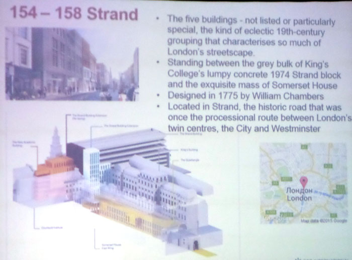 Один з яскравих свіжих прикладів активної участі громадськості у збереженні старої забудови – історія з проектом КінгзКолледж, це частина лондонського університету. У квітні 2015 вони вирішили розширитися за рахунок сусідніх будівель на вулиці Стенд, яка веде від Трафальгарської площі. Будівлі хоча і виглядали як у XVIII столітті, насправді були побудовані в 1970-х роках у вікторіанському стилі. Розробники проекту порахували, що це не дуже важливі будівлі, і запланували тут сучасні будівлі, – однак громадськість вулиці виступила проти, почалися протести. Йшлося про комерційну вигоду: сума інвестицій планувалася в 50 млн фунтів, адже студенти тут платять на рік за навчання 9 тис. Фунтів, а іноземні студенти – і зовсім 16 тис фунтів на рік.