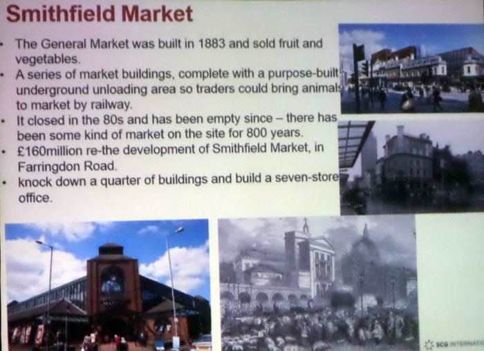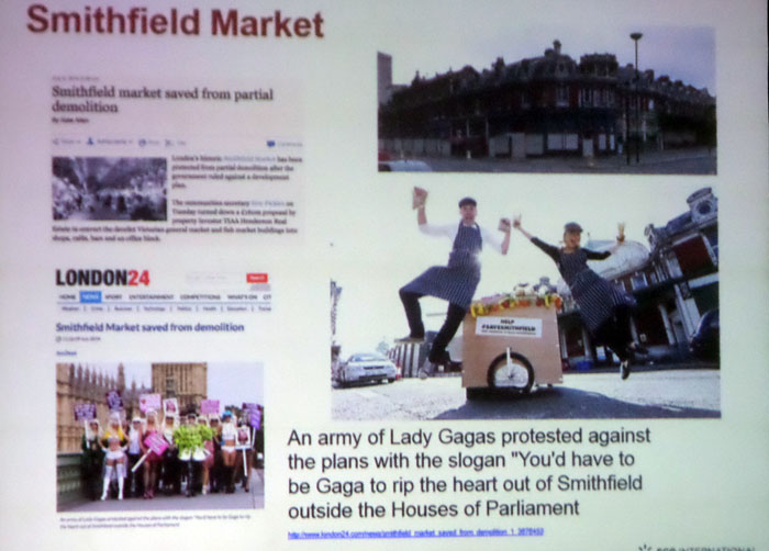 Схожа історія і з Фруктовим овочевим ринком. Сюди приїжджали люди з усієї південно-західній Британії за свининою – тож намагалися зберегти ринок, в кампанії брала участь навіть Леді Гага. У підсумку ринок відстояли, а тепер його будуть як слід ремонтувати. У цілому ж у Лондоні практика така, що в старовинні будівлі додають якісь родзинки – інакше будівлі перетворюються на неприбуткові пам'ятники архітектури і музеї, нецікаві молоді.