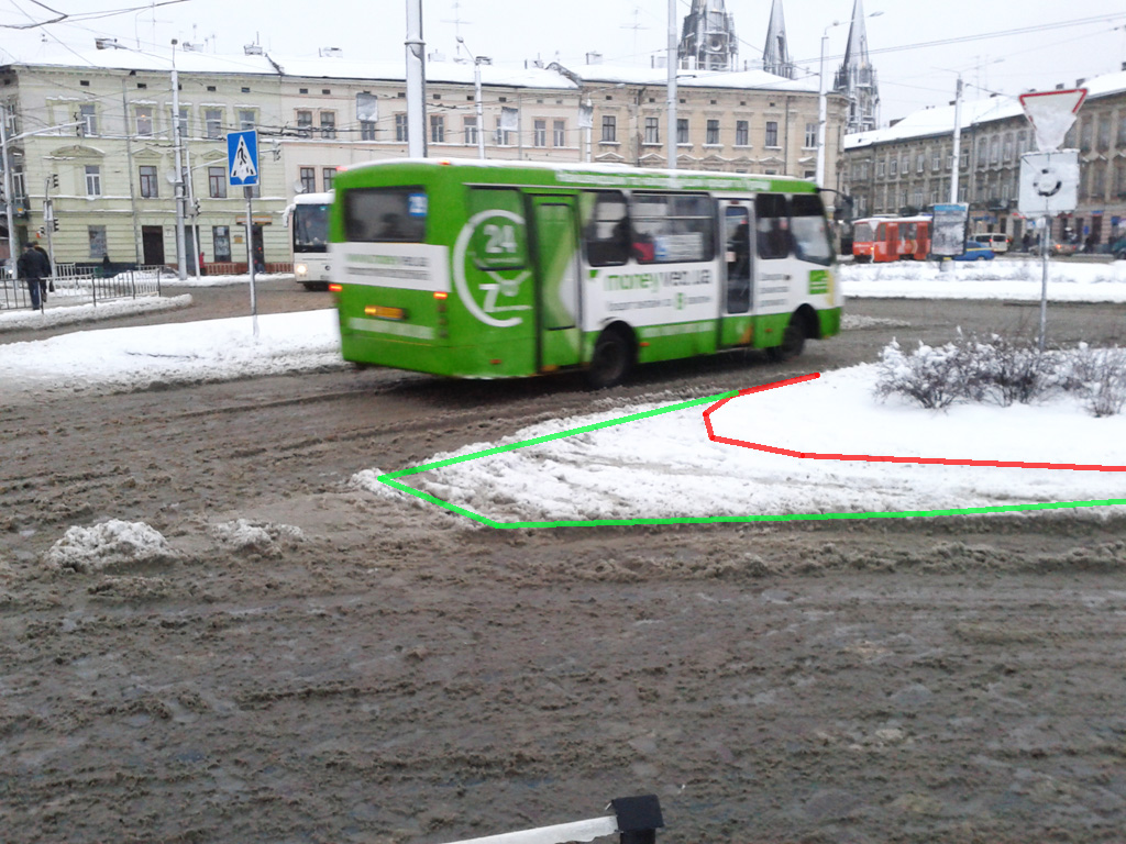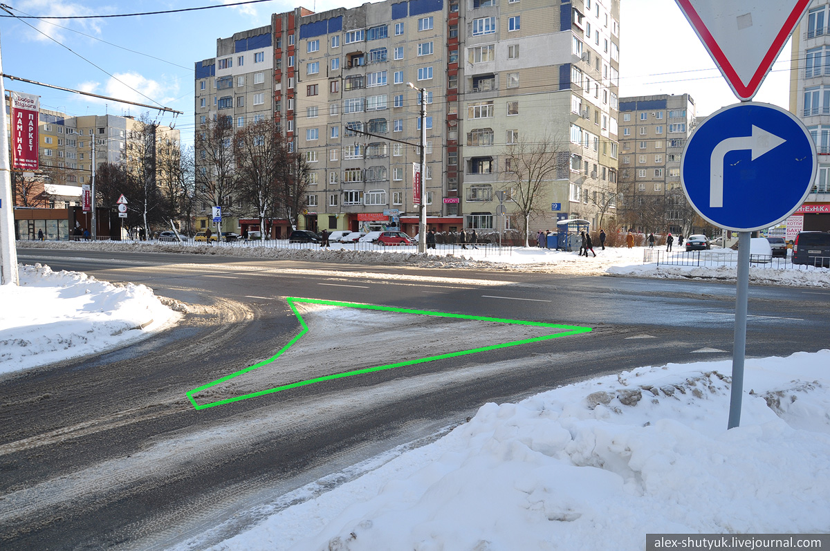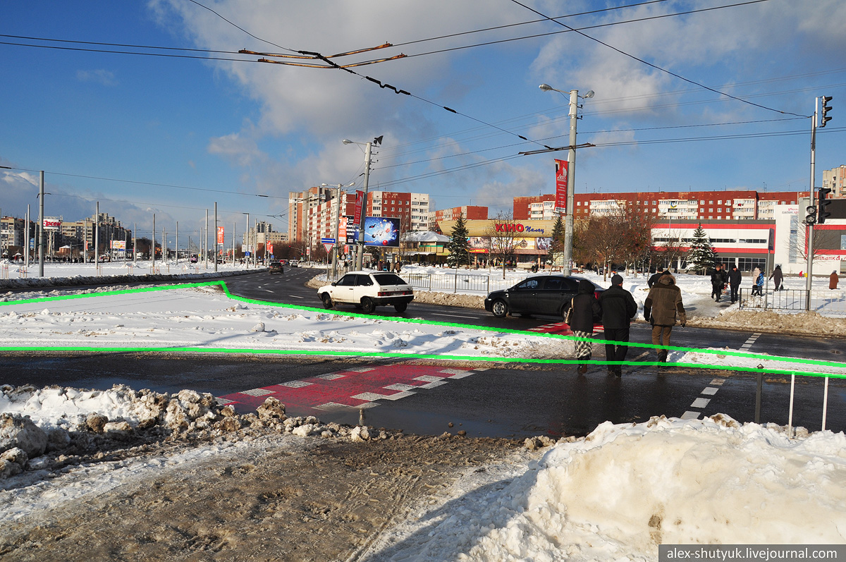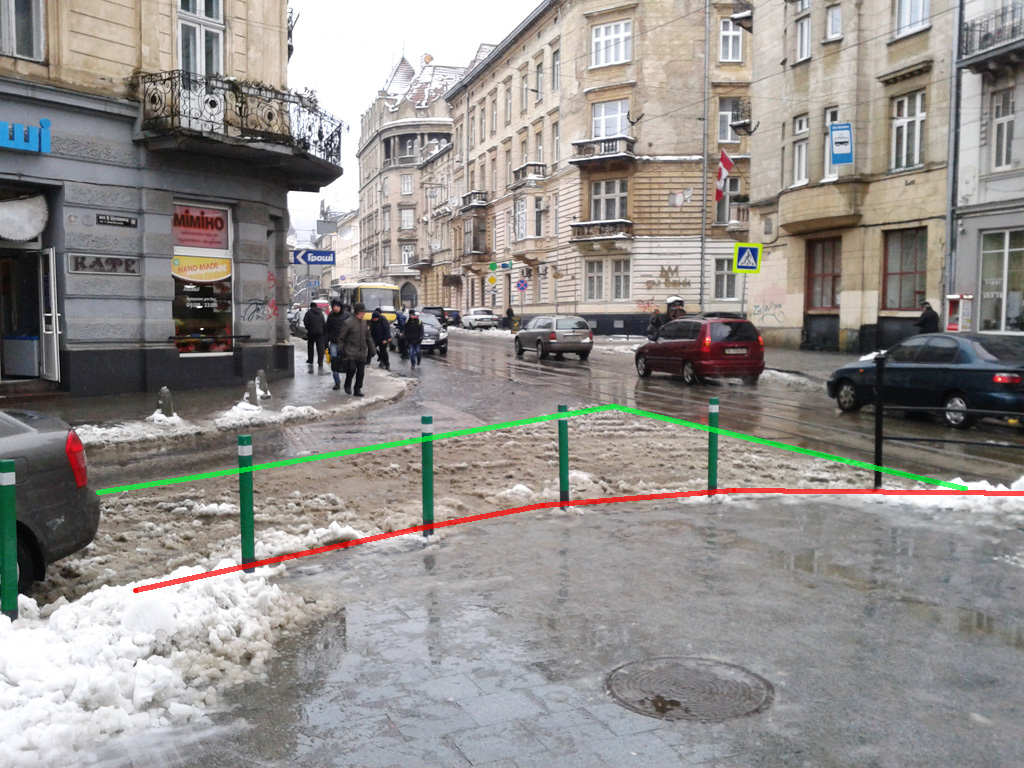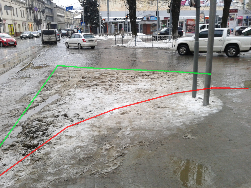 Складне перехрестя вулиць Франка, Князя Романа, Герцена та Костя Левицького. Червона лінія показує місцезнаходження наявного бордюра, а зелена - доки доходить неїжджений (майже) сніг. Звісно, що із можливою реорганізацією руху на цих вулицях картина може змінитися, але поки вона така.