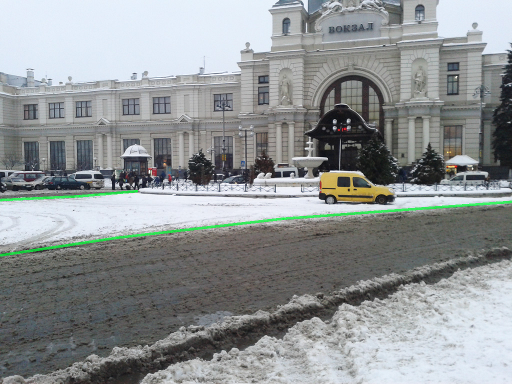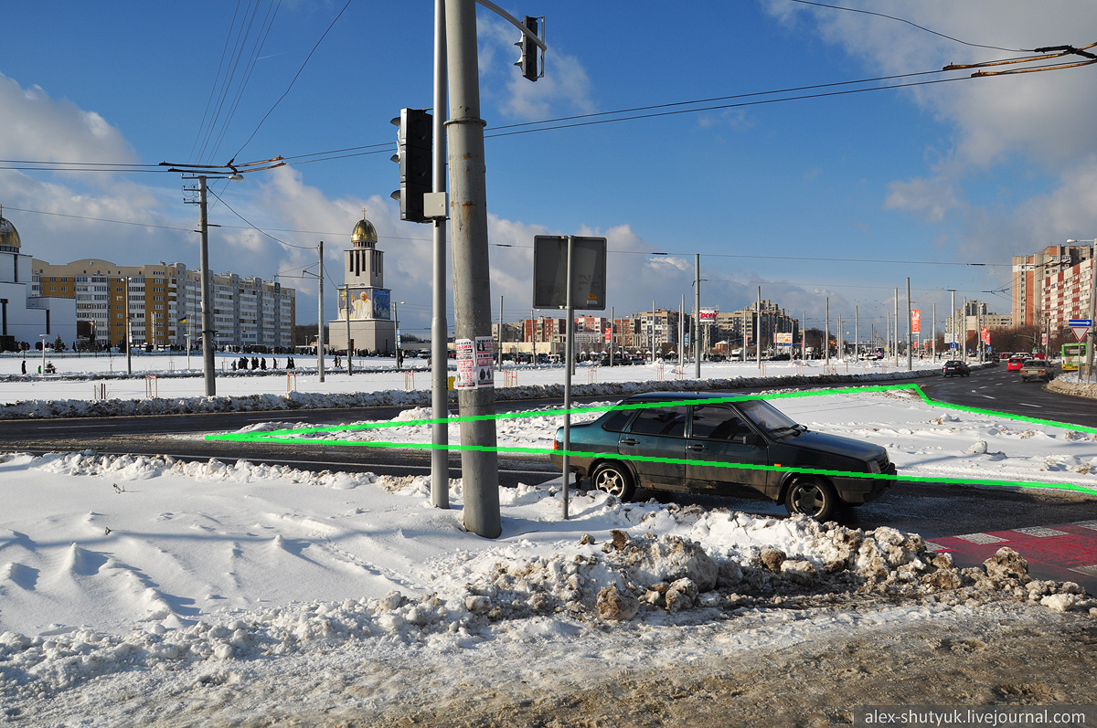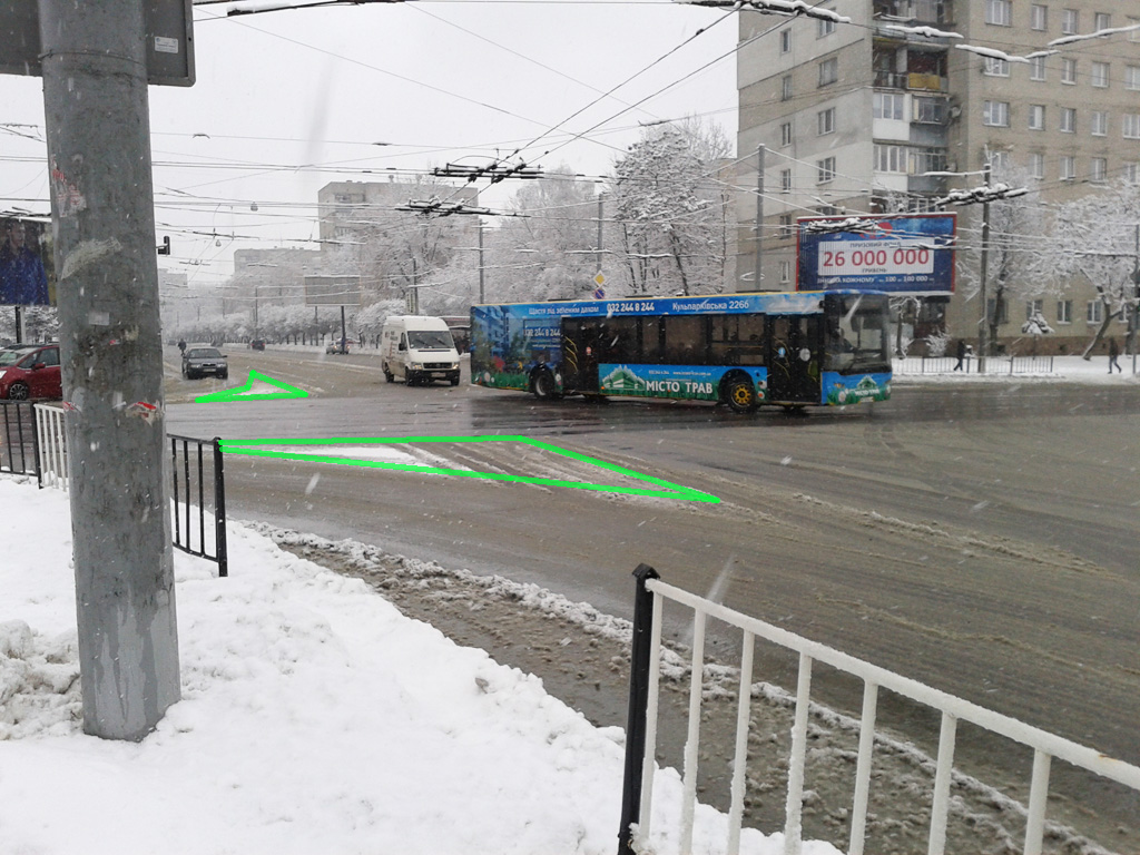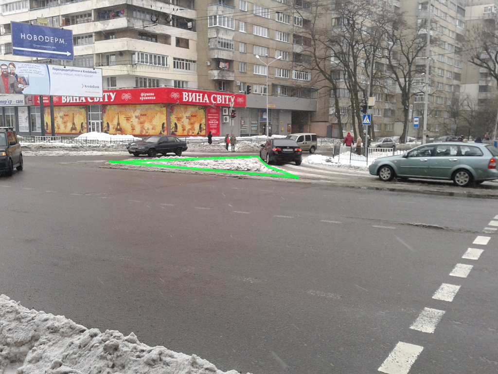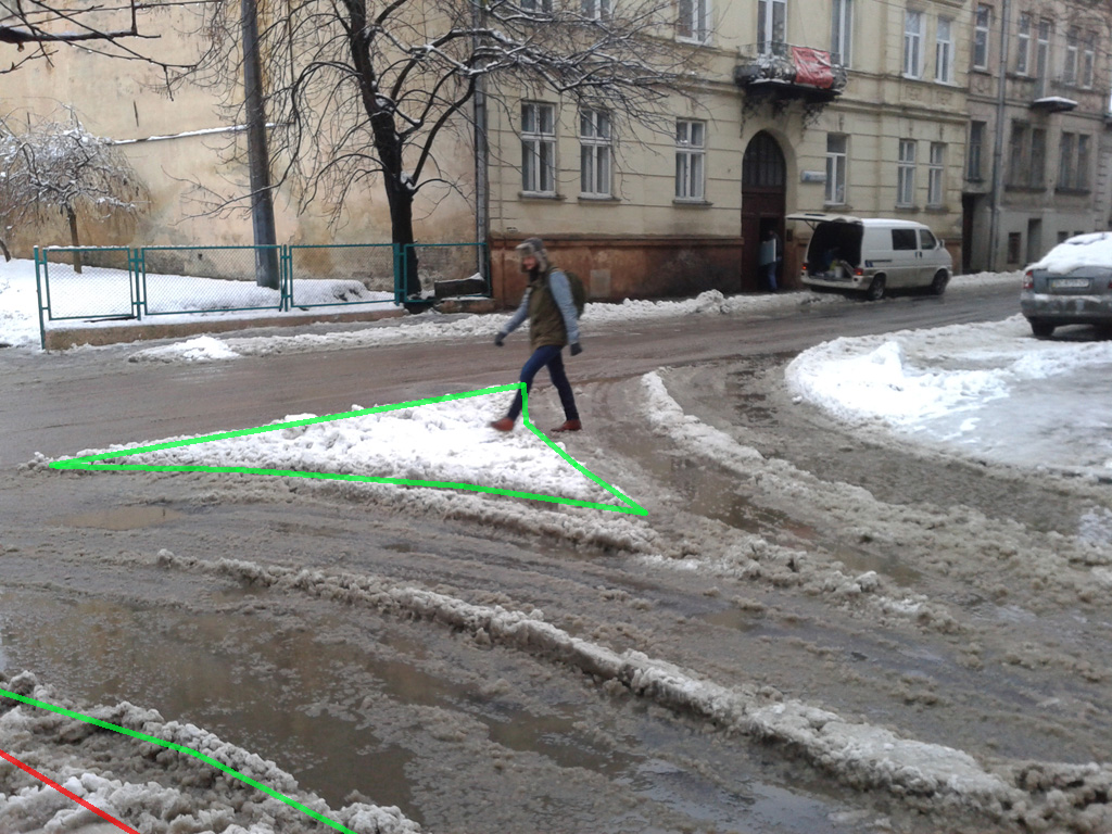 Складне перехрестя вулиць Франка, Князя Романа, Герцена та Костя Левицького. Червона лінія показує місцезнаходження наявного бордюра, а зелена - доки доходить неїжджений (майже) сніг. Звісно, що із можливою реорганізацією руху на цих вулицях картина може змінитися, але поки вона така.