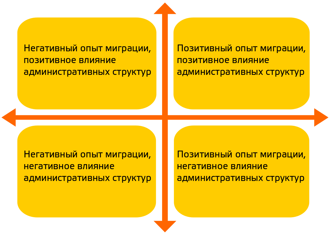 Потім ви можете проаналізувати історії і розділити їх на дві групи: 1) ті, де зіткнення з адміністративними структурами допомогло мігранту вирішити його проблеми або якось інакше поліпшило його положення, і 2) ті, де зіткнення з адміністративними структурами створило проблеми для мігранта. Таким чином у вас виникне рамка, що складається з чотирьох квадрантів: