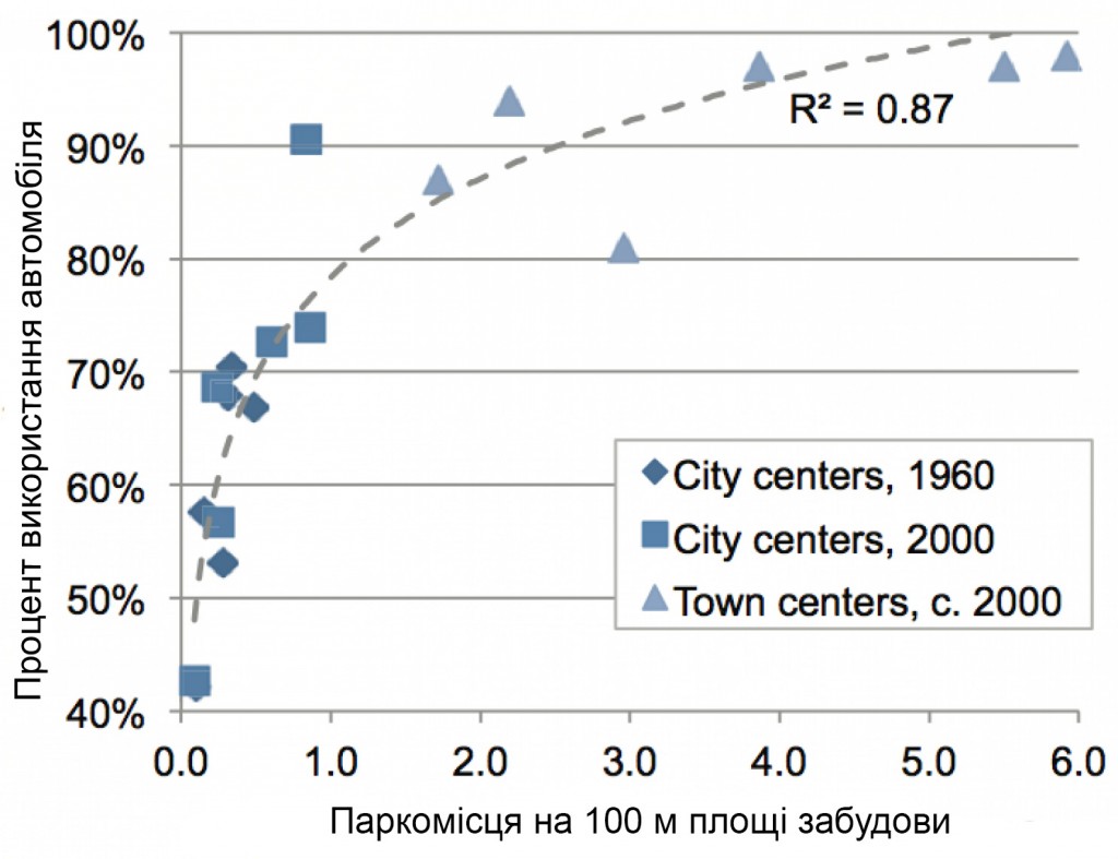 Цей графік показує, що коли паркування в цих містах досягає відмітки п’ять чи шість місць на 100 м2 території будівництва, їздять майже всі: