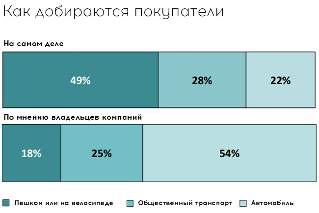 Деякі асоціації розвитку бізнесу поширюють неправдиві твердження, нібито заміна кількох паркувальних місць призведе до падіння продажів. Якщо вони дійсно стурбовані цим питанням, то повинні для початку розібратися, скільки клієнтів приходять до місцевих компаній і в магазини пішки або приїжджають на велосипеді. А розібравшись, почати цінувати цих людей і робити все можливе для їх зручності.