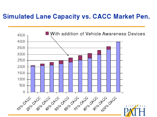 Поточна максимальна пропускна здатність становить 2200 автомобілів на годину на смугу шосе. Підвищення пропускної здатності автомагістралей також було проаналізовано в рамках Каліфорнійської програми PATH. Автоматизація дозволить скоротити проміжки перебування в транспортному засобі і скоротити відстань завдяки більш точному розрахунку шляху.