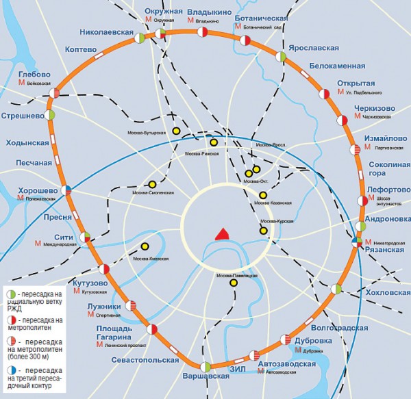 Протяжність МКЗ становить 54 кілометри. На кільці буде розташована 31 станція з транспортно-пересадковими вузлами (ТПУ). Передбачено 17 пересадок на 11 ліній Комплекси метрополітену та 9 пересадок на радіальні напрямки залізниці. Крім того, на 13 ТПУ обладнають перехоплюючі парковки.