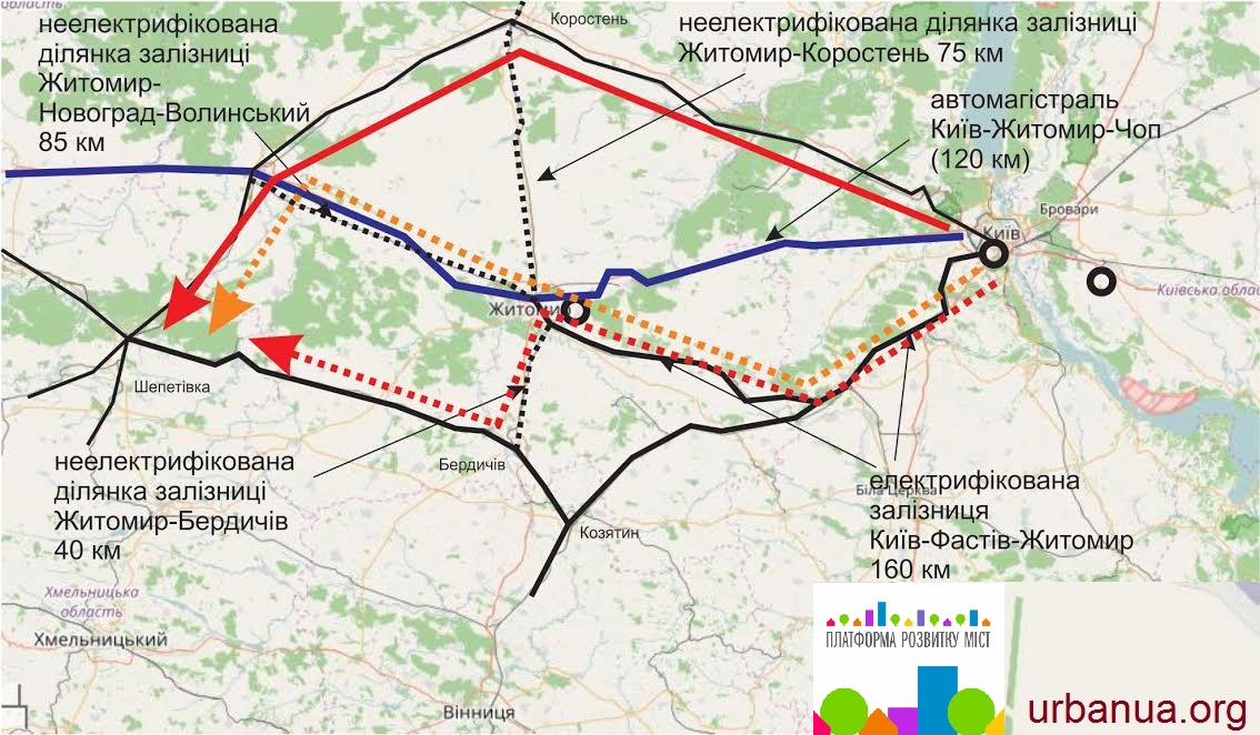 Зараз електричка Київ-Фастів-Житомир проходить цю відстань за 2,5 години - однак у разі електрифікації існуючої залізниці Житомир-Новоград довжиною 85 км. через Житомир можуть поїхати транзитні потяги, у тому числі Інтерсіті. Ось новина про такі плани за квітень 2017 http://cfts.org.ua/…/skorostnye_poezda_kiev_peremyshl_mogut…
