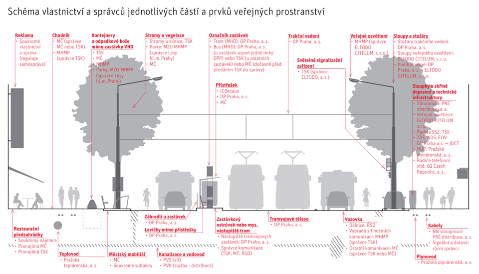 Інститут планування і розвитку Праги на своїй сторінці у фесбуці публікує просту інфографіку з поясненням, хто відповідає за різні елементи вуличного простору – за транспортну систему, рекламу, озеленення, сміття та інше. Розуміння, хто саме за що відповідає, – це перший крок до розумного розподілу повноважень і коштів, а також до взаємодії різних комунальних підприємств і структур.